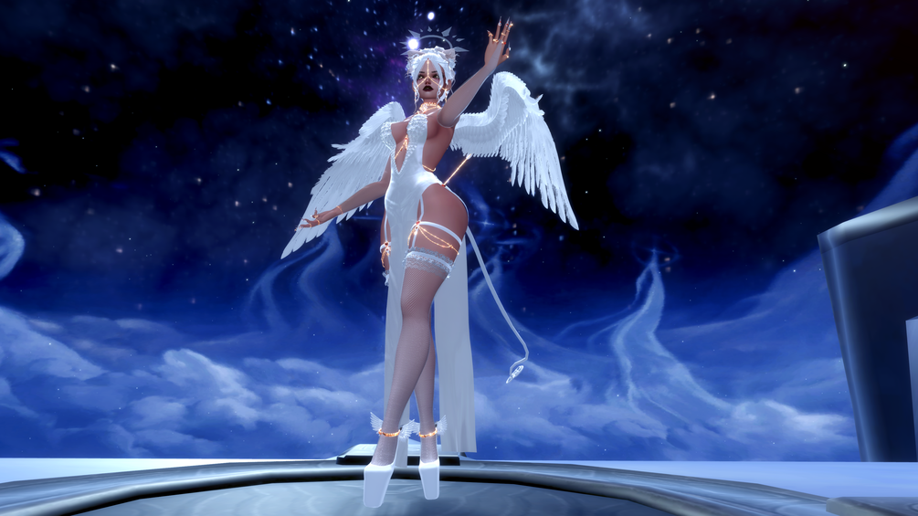 Amazing avatar with Gogo Loco and 18+ nice options(14 lights). So There are a lot of things in that Avatar like all color changes and hue(like really u can change every part of avi in-game like to Red, White or Black), Hide option, metal change(gold to silver), a skin tone change, eyes change and hue, Wings wave, there a lot of textures for clothes so u can change to type of texture u like in-game), 3 types of Hair (whit more than 18 types of colors and Hue, same for ears),3 types of heels whit some options, more than 8 outfits(u can combined with each other), 4 types of underwear and a lot of accessories for body and for a head(like really a lot)(Wings,2 type horns, nimb, blindfolds for eyes and mouth, arrows, tail, rose on the face, headband with roses, head wings, wings on heels, 3 types of garters, 2 types of gloves, 2 type of pasties and more and more).