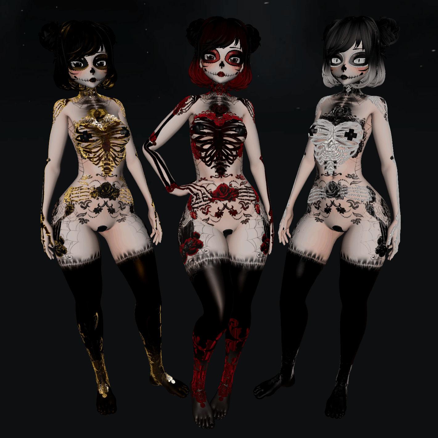 Full-Body and Face Tattoo for Female avatars are made with gothic elements. Made in the style of the Mexican holiday Day of the Dead (El Día de Muertos). Inspired by La Calavera de la Catrina.